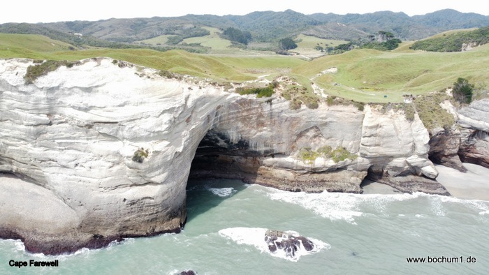 zum Cape Farewell. Die hügelige Landschaft und das satte Grün der