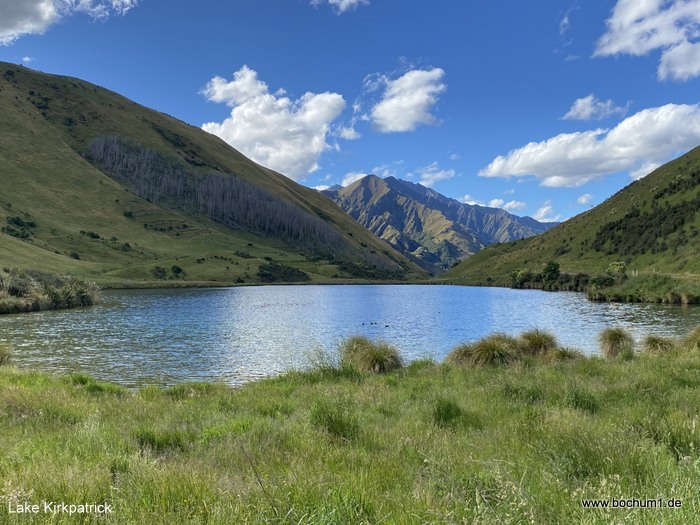 von Schafen und zuerst dem kleinen Bergsee Lake Kirkpatrick. Nach