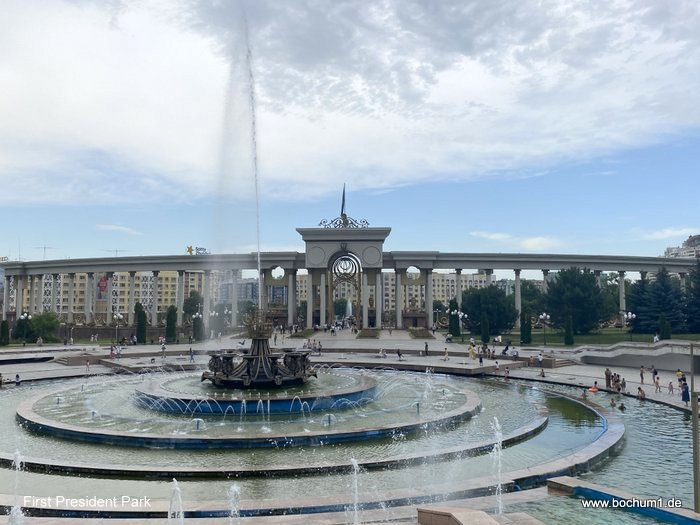 Almaty" Schild, in einer penibel gepflegten Grünanlage. Dann mit dem