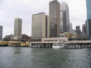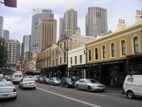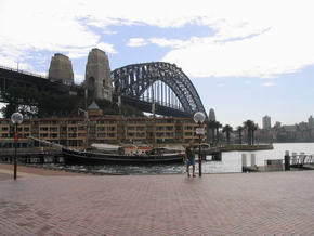 Kurz hinter Point Piper, bei Beginn der Rose Bay, war der Wendepunkt der Fahrt und es ging selbigen Weg wieder zurück. Leider kamen immer mehr Wolken auf (morgens hatten wir noch Sonneschein) und auf der Rückfahrt setzte leichter Regen ein. Eigentlich erwarteten wir, dass die Fahrt am Circular Quay vorbei, in den westlichen Hafenteil ging, da noch genug Zeit vorhanden war. Dem war aber nicht so, da das Boot der Captain Cook Cruises zwar noch unter der Harbour Bridge fuhr, aber just unter jener wieder drehte und zum Ausgangpunkt zurück fuhr. Alles in allem entgegen der Werbung als um ½ Stunde beschissen… Um 12 Uhr wieder festen Boden unter den Füßen, liefen wir zum nahen Stadtteil The Rocks, welcher 1788 Ausgangspunkt der Kolonialisierung Australien war. Wir liefen entlang der George Street, auf welcher sich alte, historische Gebäude befinden, welche zur 200 Jahrfeier 1970 restauriert wurden. |