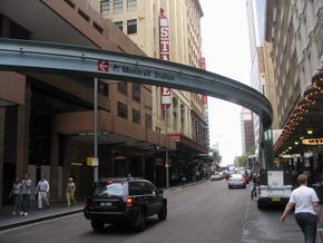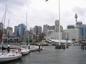 Wir durchstreiften noch ein paar Souvenirläden und Bekleidungsgeschäfte und verließen das Viertel über die George Street Richtung Süden. Vorbei am World-Trade und weiteren Hochhäusern des Business Districts, entdeckten wir im Herzen vorgenanntem, am General Post Office mit seinem 61 Meter hohen Uhrenturm, ein Food Court im Untergeschoss. Da drum herum die ganzen Hochhäuser und deren Büros sind, war der Fresstempel sehr gut besucht, da er reichlich Auswahl zum fairen Preis bot. Mittlerweile 13:00 Uhr, liefen wir die George Street entlang bis zum City Center an der Pitt Street / Market Street, wo sich verschiedene mehrstöckige Einkaufspassagen befinden. Da dort die Einschienebahn Monorail eine Haltestelle hat, kauften wir eine Tageskarte für AU$8 (AU$4 kostet es, den Rundkurs ohne auszusteigen zu fahren) und fuhren über die Pyrmont Bridge zum Darling Harbour. |