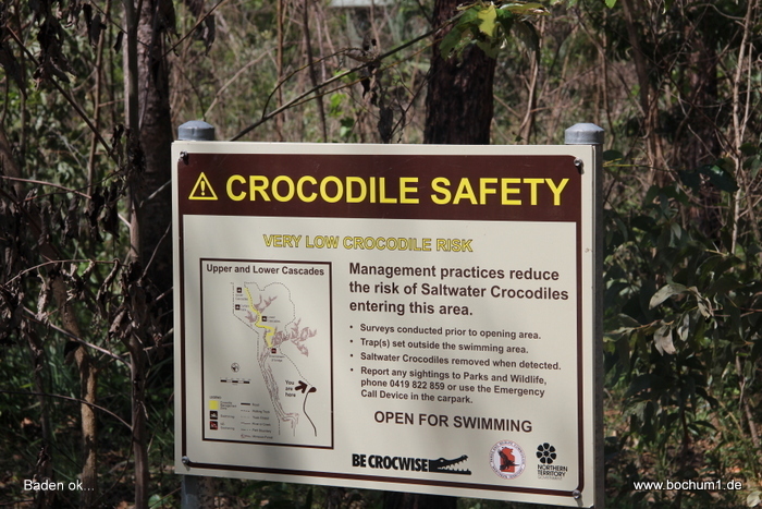 dort Salzwasser-Krokodile sind (reichlich Warnschilder vorhanden). |