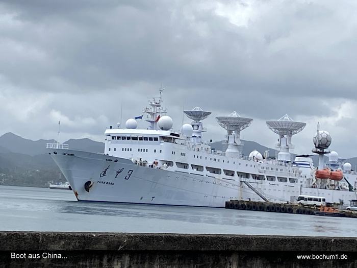 chinesischen Schriftzeichen und drei riesigen Satelliten-Antennen vor