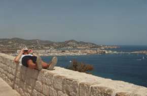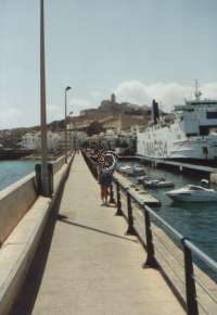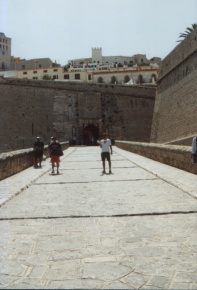 Da Ibiza ein sehr gut ausgebautes Busnetz hat, bin ich drei Tage Ende des Urlaubs zur Hauptstadt Eivissa mit dem Linienbus fahren und mir die Stadt genauer ansehen, wie ein paar Tage zuvor, wo ich schon mit dem Leihwagen dort war. Im Stadtzentrum von Portinatx befindet sich kaum zu übersehen ein Busbahnhof, von wo Vormittags um 9:15 Uhr, 10:15 Uhr und 11:15 Uhr (der nächste Bus kommt erst wieder um 15.30 Uhr), die Busse nach Eivissa fahren. Pünktlich erwischte ich jenen um 10:15 Uhr, welcher fast ausschließlich mit Touristen gefüllt war. Die Kosten für Hin- und Rückfahrt betrugen keine 10 DM (auf den Euro oder DM genau weiß ich es nicht mehr) und in dem fast bis auf den letzten Platz gefüllten Bus, erreichte ich Ibiza Stadt ohne große Umwege in 45 Minuten. Ziel war auch dort ein Zentraler Busbahnhof an der Placa Enric Fajarnés i/Tur, irgendwo inmitten der Stadt. Da ich weder Stadtplan, noch die rechte Orientierung über meinen Standort hatte, entschied ich mich für eine Richtung zu Fuss, um wieder Richtung Hafen, bzw. Geschäftsmeile zu gelangen. Leider aber für die falsche Richtung. Nach 20 Minuten zu Fuss kehrte ich wieder um und am Busausstieg wieder vorbei zur Passeig Vara de Rey, der Neustadt Ibizas. Ich flanierte an den Geschäften vorbei und entschied mich für einen Aufstieg zur Dalt Vita, Die Oberstadt wurde 654 v. Chr. von den Karthagern als Stützpunkt errichtet und dient heute den Wohlhabenden von Eivissa als Wohnort. |
