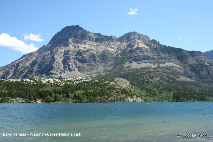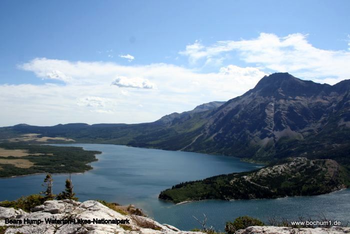 Süden auf den von Bergen eingerahmten Upper Waterton Lake bis über