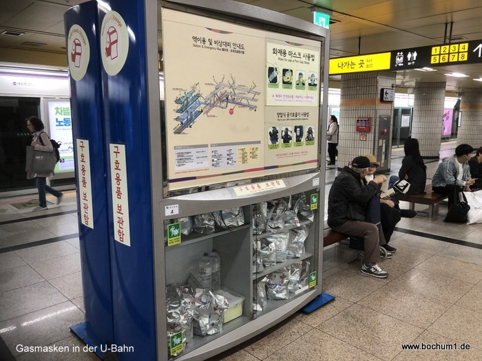 die U-Bahn, in welcher an jeder Stadion Schränke mit Gasmasken und