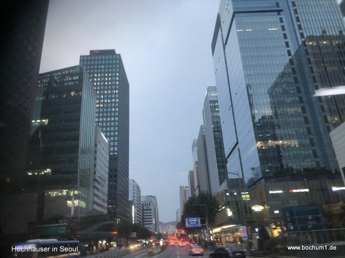 Dämmerung mit dem Bus vorbei an den Büro-Hochhäusern zum Myeong-dong