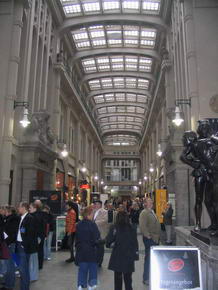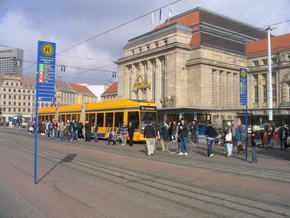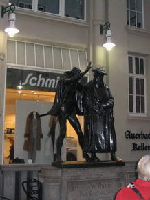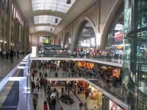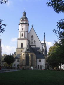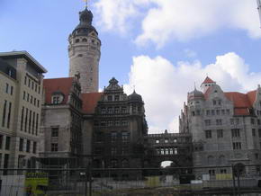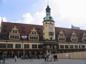 In der Passage befindet sich das berühmte Lokal „Auerbachs Keller“, wo Johann Wolfgang von Goethe als Student manche Zeit verbrachte und auch eine Szene im Faust an jenem Ort spielen ließ. Vor dem Auerbachs Keller ist eine Status aus Faust, dessen Fuß zu berühren angeblich Glück bringen soll. Nächstes Ziel war das alte Rathaus, erbaut 1556 bis 1557 in welchem sich das stadtgeschichtliche Museum befindet. Leider befand sich zum Zeitpunkt unseres Besuches im Oktober 2004, davor eine große Baustelle. Weiter zur im Jahre 1500 umgebauten spätgotischen Thomaskirche, in welcher freitags und samstags der berühmte Thomanerchor singt und aus deren ehemaligen Sängerknaben sich die Band „Die Prinzen“ formierte. Auch Johann Sebastian Bach war jener Kirche verbunden, indem er 27 Jahre den Thomanerchor leitete. Wahrscheinlich nicht nur dafür, setzte man ihm ein Denkmal am Südausgang des Gotteshauses. In unmittelbarer Nähe befinden sich diverse Geschäfte, in welchen man Noten und Instrumente für klassische Musik erhält und das Bach Haus. Dort war auch der Wendepunkt unseres Stadtrundgangs und wir liefen zurück zum Ausgangspunkt. Dabei kamen wir an einem Kino mit recht imposanter, moderner Außenfassade vorbei, in welchem ein Maggi Koch Studio integriert ist. Das meint ein kleines SB-Restaurant, in den Farben und mit Logo des aus der Werbung bekannten Maggi Koch Studios, in welchem man die eigentlichen Tütengerichte und sämtliche Merchandise Produkte kaufen kann.Sah wirklich witzig aus. Direkt angrenzend befand sich eine weitere große Baustelle und dahinter das aktuelle Leipziger Rathaus, 1905 erbaut und einer Festungsanlage ähnlich sehend. Weiter ging es durch die Fußgängerzone, vorbei an der riesigen Baustelle des neuen Karstadt Hauses. |