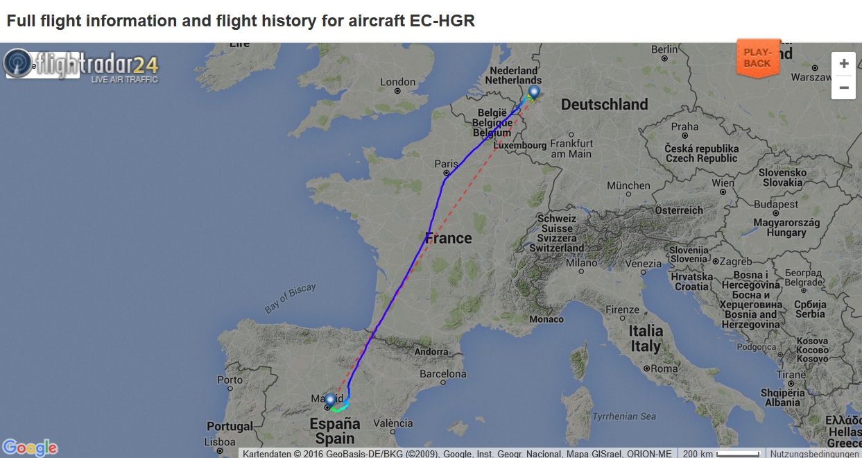 Von Düsseldorf flogen wir südwestlich nach Belgien, dann quer über