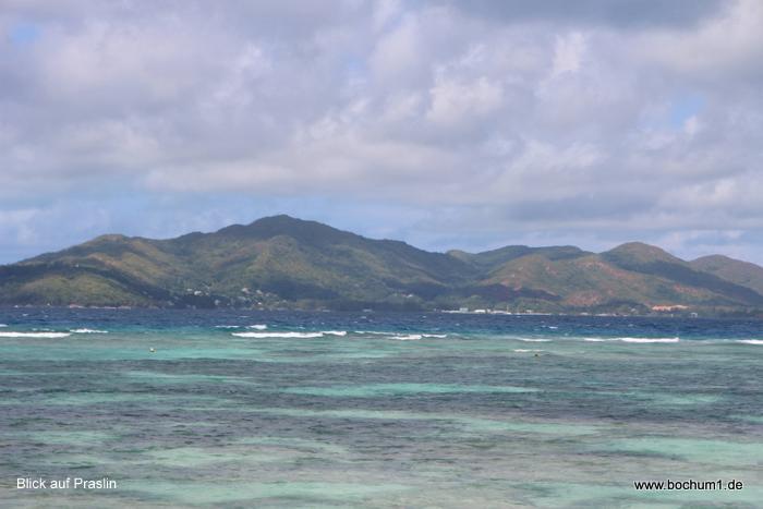 Blick auf das Meer, den Hafen und die Insel Praslin in naher Ferne.