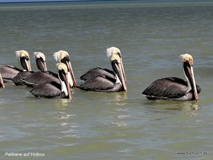 sieht man Pelikane auf dem Wasser schwimmen, bzgl. in der Lagune