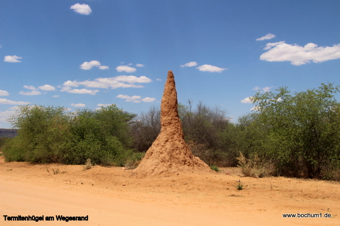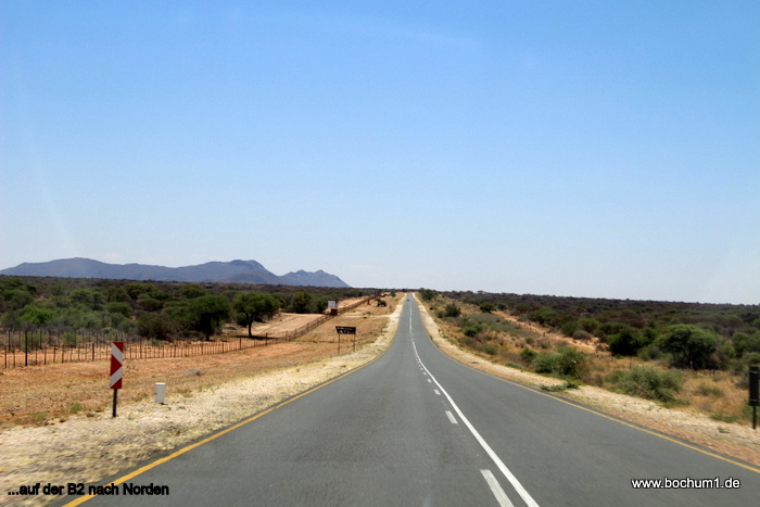 Zurück am Auto wollte ein selbsternannter Parkwächter für seine Dienste 50 NAD = 3 EUR von uns – man kann es auch übertreiben und geht deshalb leer aus. Mittlerweile bereits 35 Grad, fuhren wir 1 Std. 20 Min. bei erlaubten 120 km/h weiter über die asphaltierte B2 Richtung Otjiwarongo durch eintönige Farmlandschaft mit Zäunen am Wegesrand, gesäumt von Büschen. Unterwegs entdeckten wir durch Zufall im Radio den deutschsprachigen Sender nbc Funkhaus Namibia, einer Mischung aus Schlager-Musik und Nachrichten die den südlichen, afrikanischen Kontinent betreffen. Im weiteren Verlauf des Urlaubs hörten wir den Sender öfters, auch wenn die Moderation etwas „amateurhaft“, verglichen mit Deutschland, war.