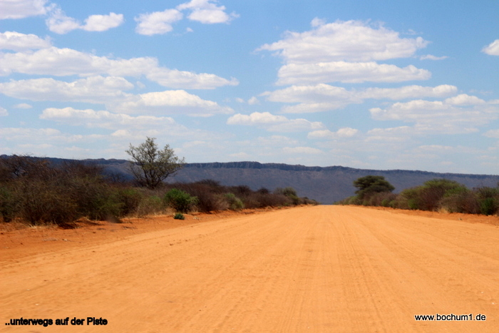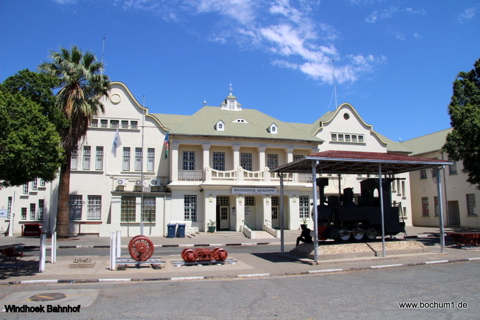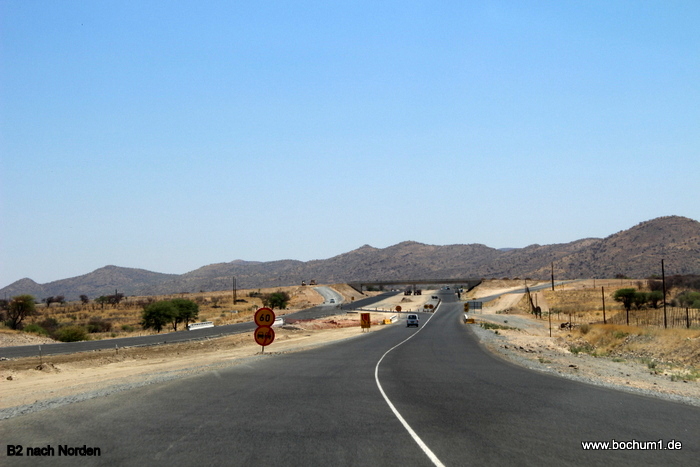 Von dort fuhren wir durch den quirligen Montagmorgen-Autoverkehr zur Windhoek Railway Station. 1912 erbaut, ein historisches Gebäude im Wilhelminischen Jugendstil und der kleinen Schmalspur Lokomotive Old Joe davor. Gegen 10 Uhr machten wir uns schließlich auf den Weg über die B2 nach Norden, aus dem Hochland um Windhoek hinunter (es wurde folglich wärmer), vorbei an der Otjihaverabergen. Unterwegs waren schwere Bautätigkeiten, da die B2 wohl 2-spurig ausgebaut wird. Nach knapp 1 Std. Fahrt erreichten wir den Ort Okahandja mit einem großen Craft Markt in windschiefen Holzhütten. Dort schauten wir uns die zahlreich angebotene afrikanische Handwerkskunst und Schnitzereien aus Angola und Zimbabwe an, kauften aber letztendlich mit langwierigem Handeln nur 2 Autonummernschilder (Namibia und Südafrika) für die heimische Garage.