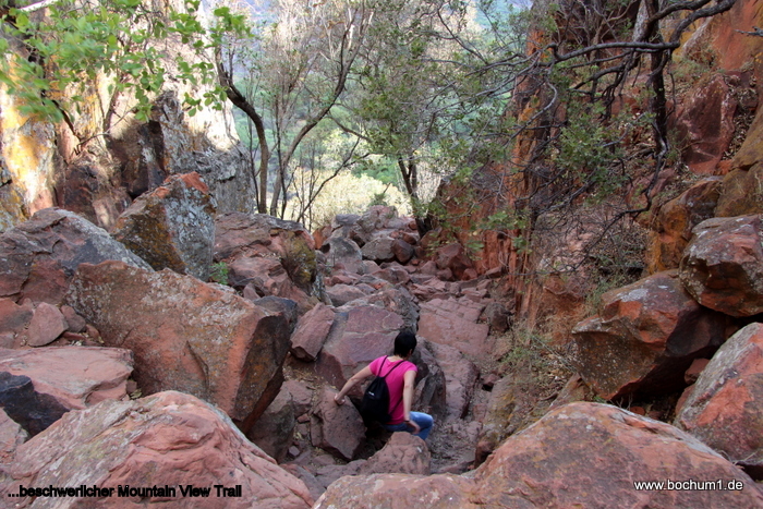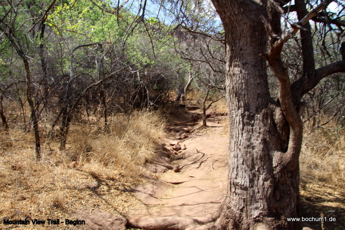Aber dafür war unsere Zeit leider zu knapp und die Wanderung war als schöner beschrieben (was ich bestätigen kann). Da das Waterberg Camp, bezogen auf das Areal, nicht unbedingt klein ist, fuhren wir ca. 1,5 km zu unterer Unterkunft - einer Doppelhaus-Hütte. Nach dem Ablegen unserer Koffer machten wir uns auch gleich auf den Weg für die Wanderung des Tages, den Mountain View Trail - hinauf auf das Plateau der Tafelberge. Bis auf diesen Trail, den man ohne Guide machen kann, ist der Rest des Plateaus ein Naturschutzgebiet und nur im Rahmen eines Game Drives oder einer geführten Wanderung zu erreichen. Der Mountain View Trail begann ganz moderat durch einen kleinen Wald und führte weiter leicht bergauf durch steiniges Gelände.