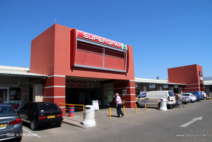 Nach einem ausgiebigen und guten Frühstück im Hilton Windhoek waren wir schon gegen 8.30 Uhr unterwegs. Es erwartete uns strahlender Sonnenschein und hochsommerliche Temperaturen. Unser erstes Ziel war der Superspar Maerua Supermarkt, angeblich der Größte Supermarkt in Namibia. Dort deckten wir uns mit ein paar Kleinigkeiten zu Essen für unterwegs ein und natürlich auch mit Getränken. Für deutsche Verhältnisse war der Supermarkt nicht wirklich groß (ein Standard Aldi Markt x 1,5), aber das Sortiment beinhaltete zahlreiche deutsche Lebensmittel mit deutsch-sprachiger Beschriftung. An der Kasse waren 3 Personen beschäftigt, eine kassierte, eine packte ein und die Dritte wollte uns die Einkäufe zum Wagen tragen (was wir aber ablehnten).