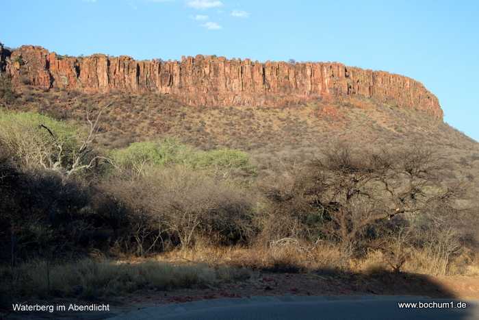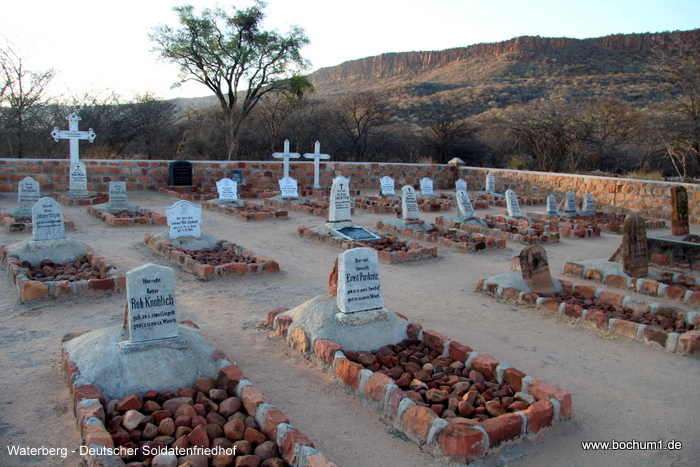 Dort relaxten wir weitere 30 Min., machten uns in unserer Hütte anschließend „abendfein“ und fuhren 1,5 km hinunter zum Nationalparkeingang. Dort sahen wir uns in dem spärlich ausgestatteten Supermarkt um und wollten eigentlich an der angrenzenden Tankstelle den Wagen volltanken. Aber es war bereits 18.10 Uhr und der Tankwart winkte ab, da er um 18 Uhr pünktlich Feierabend macht. Egal – unser nächstes Ziel war der 2 km entfernte (üble Piste – 4 WD erforderlich) deutsche Soldatenfriedhof. Denn am Waterberg gab es im Aug. 1904 eine fürchterliche Schlacht zwischen der Volksgruppe Herero und der deutschen Kolonialmacht mit sehr hoher Opferzahl auf Seiten der Herero. Schließlich fuhren wir zurück zum (einzigen, dem Camp zugehörigen) Restaurant und sahen von dort den Sonnenuntergang, der die roten Felsen zum Glühen brachte. Es folgte ein leckeres Oryx-Steak und der Heimweg mit dem Wagen zu unserem Bungalow gegen 21 Uhr.
