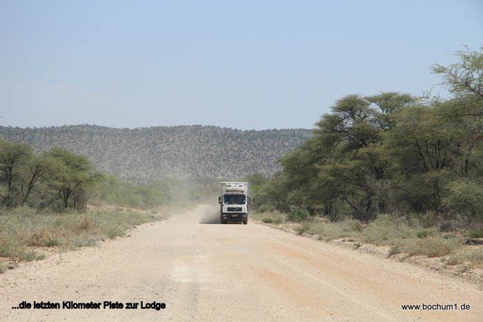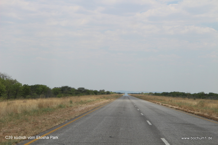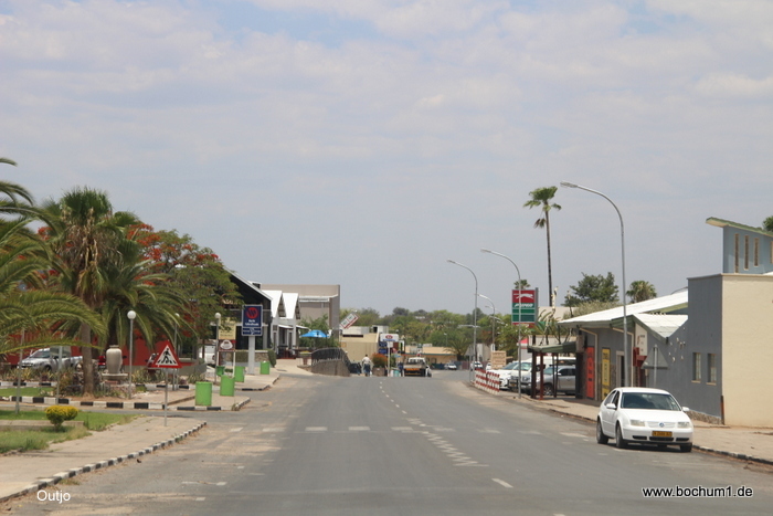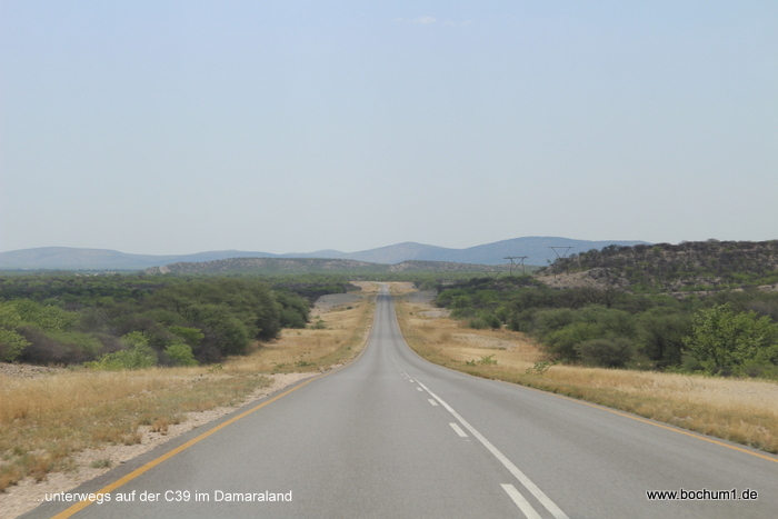 Ich würde deshalb in Zukunft eher außerhalb des Parks nächtigen und ggf. 30 Min. Anfahrt in Kauf nehmen. Vom Anderson Gate fuhren wir die die asphaltierte C 38 eine Stunde nach Süden und erreichten den Ort Outjo. Entlang der C 38 reihen sich diverse Luxus-Game-Reserves, dessen Häuser man in der Ferne auf Hügeln teilweise von der Straße aus sehen konnte. Wie wir feststellten, ist der Ort Outjo recht groß, sodass wir im lokalen Spar-Supermarkt unsere Vorräte auffüllten und den Fahrzeug-Tank gleich mit. Dann ging es weitere 45 Min. westlich auf die C 39 Richtung Khorixas, anfangs noch durch die Ebene, später durch die ersten Hügel des Damaraland, worauf die Strecke interessanter wurde.