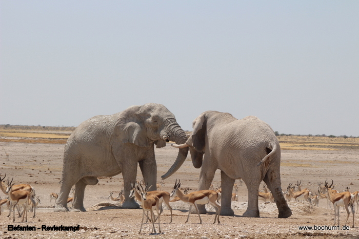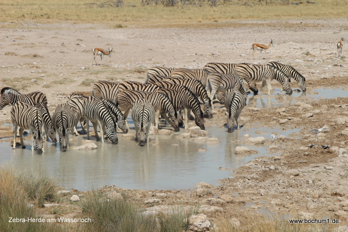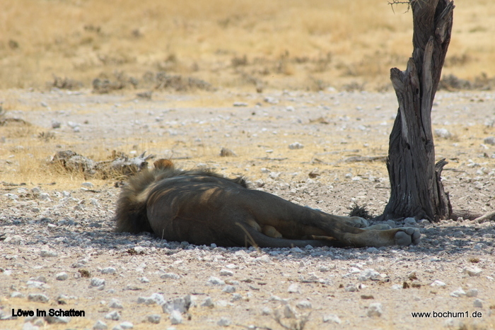 Da das Halali-Hotel so fürchterlich war (das Schlechteste unserer Reise), verließen wir früh unsere Unterkunft. Zuvor frühstückten wir im Restaurant mit Kantinen-Charakter und waren um 8.30 Uhr wieder unterwegs. Erneut stand uns ein fürchterlich heißer Tag mit über 40 Grad Celsius bevor. Wir fuhren wie schon am Vortag das ein oder andere Wasserloch ab, machten aber diesmal keine großen Schlenker, sondern nur jene, welche nahe der Haupt-Durchgangspiste sind. Wie immer sahen wir Springbock-, Elanantilopen,- Oryx-. Gnu- und Zerbra Herden, welche man aber recht häufig im Etosha Park sieht. Aber am letzten Wasserloch vor dem westlichen Okaukuejo Camp hatten wir final großes Glück.