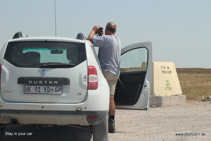 Da wir vor zwei Tagen um 11.30 in den Park gefahren sind, wären wir mit dem Schlenker niemals um 11.30 Uhr am Parkausgang gewesen und hätten für ggf. 30 Min. „überziehen“ einen kompletten Tageseintritt bezahlen müssen. Also fuhren wir die ab dem Okaukuejo Camp endlich wieder asphaltierte Straße zum Parkausgang am Anderson Gate, mit einem kleinen Schlenker zum letzten Wasserloch. Dort sahen wir zum letzten Mal in diesem Urlaub Giraffen und verließen um 11.45 Uhr den Etosha Nationalpark. Der Besuch gehört zu jedem Namibia-Besuch! Tiere gibt es im Etosha Park reichlich – nur ist es absolute Glücksache welche man sieht.. Gestört haben uns die Hotels / Camps im Park für die wir mit ~ 175 EUR pro Nacht viel Geld bezahlt haben, aber deren Qualität dazu in keinem Verhältnis stand.
