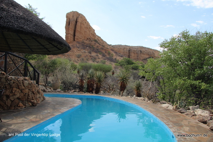 Schließlich bogen wir auf die breite Piste (=nicht asphaltiert) D 2743 ab, woraufhin wir die ersten Tafelberge im Stil des Monument Valley in den USA sahen. Nach 20 km Piste erreichten wir die Vingerklip-Lodge, unsere Unterkunft für die kommenden 2 Nächte. Das große Haupthaus mit mehreren Doppelhaus-Hütten in der einsamen Landschaft „á la Monument Valley“ verstreut sind – im afrikanischen Stil alle mit Reetdach. Nach dem Welcome-Drink an der Bar mit leicht erhöhten Blick auf das Tal und dem Vingerklip (ein 35 Meter hoher Fels-Finger) bezogen wir schließlich unsere Hütte. Geräumig auf 2 Etagen, im Afrika Stil eingerichtet mit großer Terrasse mit Blick auf einen nahen Tafelberg und zwei im Hintergrund. Da es wieder 40 Grad waren, machten wir uns umgehend auf den Weg zum Pool.