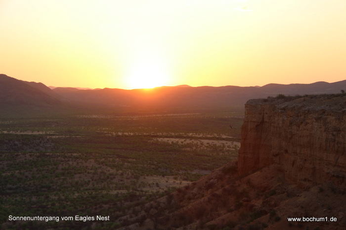 Geschätzt 150 Meter über dem Lodge-Areal hatten wir einen hervorragenden 300 Grad Blick auf das weite Tal mit den Tafelbergen und dem Vingerklip. Dort oben befindet sich zudem eine VIP-Hütte, das „Heavens Gate“ (sogar mit kleinem Pool), und da diese aktuell nicht von Gästen belegt war, konnten wir uns diese kurz ansehen. Schließlich erfreuten wir uns von der nahen Aussichtsplattform aus, mit nur 5 weiteren Gästen, an dem Sonnenuntergang. Daraufhin aßen wir im Eagles Nest zu Abend. Es wurde für nur 7 Gäste ein verschwenderisch großes Buffet aufgefahren mit Salaten und verschiedenen Fleischsorten von lokalem Wild. Einfach herrlich dort oben – einer der Top 3 Höhepunkte unseres Urlaubs. Gegen 21 Uhr begaben wir uns über die beleuchtete Gerüst-Treppe und weiter über den Pfad wieder hinunter zur Lodge, nahmen an der Bar noch einen Absacker und gingen schließlich in unsere Hütte.
