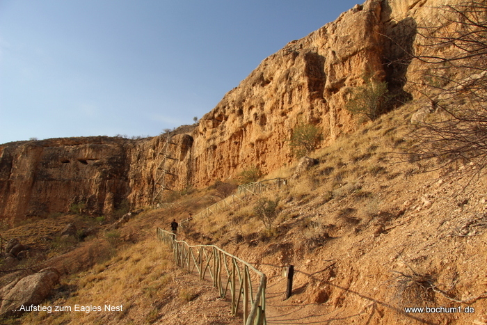 Die Anlage besitzt 2 Pools, einen in Blickrichtung Fingerklip und Ugab Terraces (eine Felsnase) und einen weiteren zu den 3 Tafelbergen. Da der Vingerklip Pool größer ist, nahmen wir heute mit jenem vorlieb. Man muss sich vorstellen dass die gesamte Fingerklip-Lodge autark lebt, ergo Strom wird mit Fotovoltaik erzeugt und gespeichert, bzw. Wasser aus Brunnen gefördert. Zwar haben die Hütten keine Klimaanlage und Kühlschrank, aber dies würde wohl den Stromverbrauch sprengen. Aber ansonsten fehlte es an nichts. Um 18 Uhr begaben wir uns auf den Spaziergang zum Eagles Nest, ein zur Lodge zugehöriges Restaurant auf der Felsnase Ugab Terraces. Dazu liefen wir 10 Min. über Serpentinen bergauf und schließlich 10 weitere Min. über eine Gerüst-Treppe weiter aufwärts.