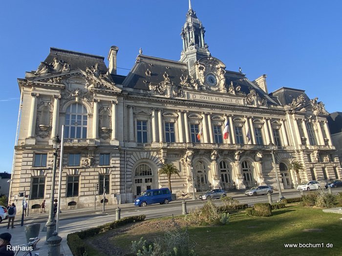 Rathaus (Hôtel de Ville de Tours) mit Statuen und einem Uhrenturm ist.