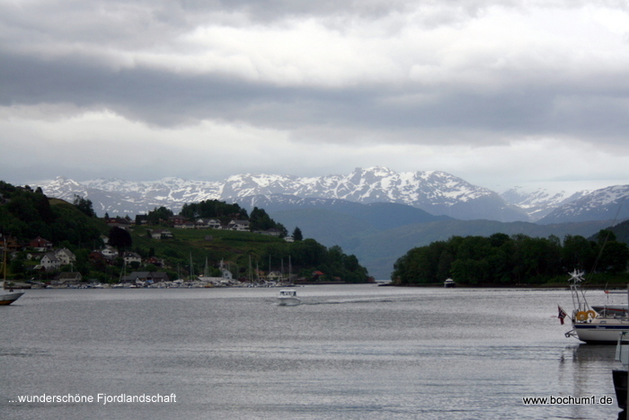 Gipfel schneebedeckt) und die Straße fast immer am Fjordufer entlang. Nach 1