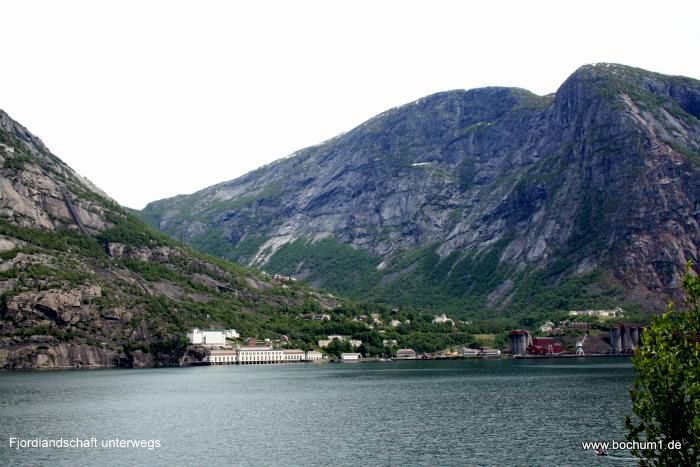 dessen Nordufer die Stadt Odda. Von der Landstraße sah man bereits den