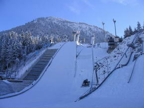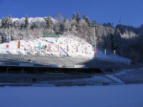 Es bestand die Überlegung, dort für ein paar Stunden auf dem mit 10 Pistenkilometern auch eher kleinen, aber mit 2.224 Meter ünN hohen Skigebiet zu fahren, aber als ich die Schlange sah, wurde mir bewusst, dass ich innerhalb der nächsten zwei Stunden niemals in der Gondel seien würde. Des weiteren war auch die Hälfte der Abfahren gesperrt. Also wieder zurück zum Auto. Da die Skiflugschanze in der Nähe war und am Vortag erst das Springen im Rahmen der Vierschanzentournee war, fuhren wir doch mal dorthin. Die Presse war mit dem Abbau der Gerätschaften beschäftigt und so stand das Tor auf, sodass wir nicht nur in das Stadion, sondern auch gleich in die Auslauffläche der Springer kamen. Gegen 11 Uhr hatten wir so die Möglichkeit, einige Springer beim Training von der großen Skiflugschanze zu sehen (es befinden sich mehrere kleinere direkt rechts daneben), welche sicherlich weiter flogen, als Sven Hannawald in seinem schon länger währenden Formtief. |