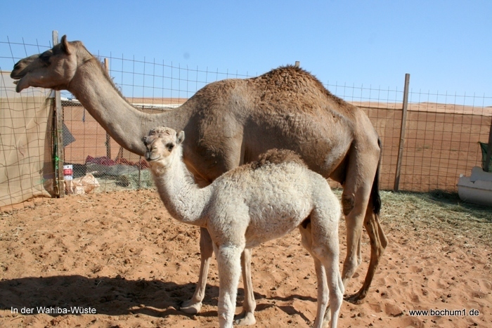 Vorgarten“ ein Kamel-Muttertier mit ihrem Jungen stand.