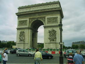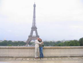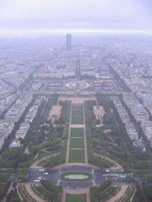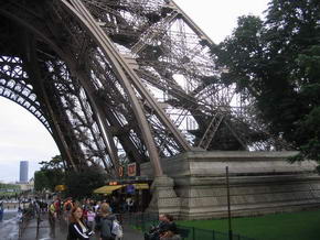 Nachdem wir jenen Vorzeigeboulevard, welcher bei dem trüben Wetter und der vielen Touristen farblos wirkte, etwa 1 km entlang gelaufen sind, stiegen wir an der Station George V in die Metro. Ziel war die Station Trocadero, denn an dem gleichnamigen, angrenzenden Park hat man den aus Postkarten bekannten Blick auf den 317 Meter hohen Tour Eiffel (Eiffelturm). Leider begann es zu regnen, als wir aus dem Untergrund kamen. Nichtsdestotrotz schossen wir aus dieser guten Perspektive zum Eiffelturm (ca. 400 Meter entfernt) Fotos, spazierten durch den Jardin de Trocadero (Park) und gelangten zur Seine. Wegen des Wetters verzichteten wir auf eine Bootsfahrt und liefen bis direkt unter den Eiffelturm. Trotz des hohen Preises von 10,70 Euro pro Person (selbst laufen über 1.650 Stufen kostet 3,50 Euro) fuhren wir auf den Turm. |