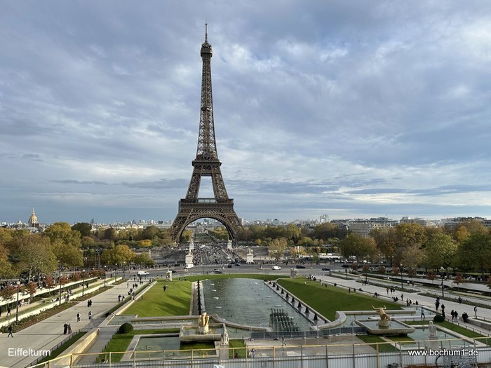 durch die Jardins du Trocadéro und über den Fluss Seine zum Eiffelturm.