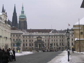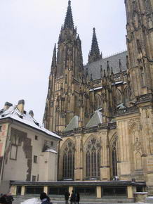 Wahrscheinlich sind sie auf ebenso vielen Fotos, wie die Mitglieder der englischen Königsfamilie zusammen. Wir durchschritten das Matthias Tor (vor welchem die Wachen stehen), um in den Innenhof zu gelangen. Das Gebäude drum herum ist gleichzeitig Sitz des tschechischen Staatspräsidenten Václav Klaus, welcher zur Zeit unseres Besuches auch im Lade war, was durch die tschechische Flagge zum Ausdruck gebracht wird, welche vorm Gebäude im leichten Schneetreiben wehte. Über den Innenhof gelangten wir durch einen Durchgang zum zweiten Burghof und der Heilig Kreuz-Kapelle. Den Erzählungen unserer Reiseführerin (klassisch mit einem roten Schirm, den sie immer hochhielt) folgten wir selten, da der Hradschin wohl der kälteste und zugigste Ort in ganz Prag ist und wir mit Bewegung (nein, nicht diese, sondern auf uns ab zu gehen) beschäftigt waren, um nicht vollends einzufrieren. Im weiteren Verlauf kamen wir über vorbei an der Burggalerie zum dritten Burghof und dem sich dort befindlichen Veitsdom. Gebaut im gotischen Stil von 1344 bis 1929, also 585 Jahre. Da sag noch mal einer, die Tschechen sind gute und vorallendingen schnelle Arbeitskräfte.... Im Veitsdom wurden Könige gekrönt und böhmische Herrscher sind dort begraben. Von innen ist der riesige Bau für mich als Banause anzusehen wie jede andere Kirche, lediglich auffallend groß ist sie. |