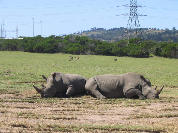 Dieses kam auch umgehend, ebenso wie die junge Dame, welche uns durch den Park führte. Zu unserer Überraschung sogar eine deutsche Muttersprachlerin, welche schon seit Jahren in Südafrika lebt. Die zweite Überraschung war, dass die Tour dadurch, dass wir nun vier Leute sind, nicht mehr 200 ZAR, sondern 115 ZAR/Person = 15,31 Euro kostet. Mit einem Safarifahrzeug mit untersetzten Gängen ging es los, in dem Park hinein. Bei Leibe kann ich nicht mehr alle Tiere aufzählen, welche wir gesehen haben. Ich weiß lediglich noch von den Zebras, Buntböcke, drei Giraffen, zwei Nashörnern, Büffeln, Nyala (ebenfalls Übersetzung unbekannt), und zwei Riesenschildkröten, davon eine jenseits der 70 Jahre alt. Die meisten Tiere lebten in Herden, dabei auch unterschiedliche Gattungen friedlich miteinander. Im Gedächtnis geblieben ist mir aber die Herde der ausgestoßenen, wo unterschiedliche Spezies in einem Verbund zusammen lebten. |