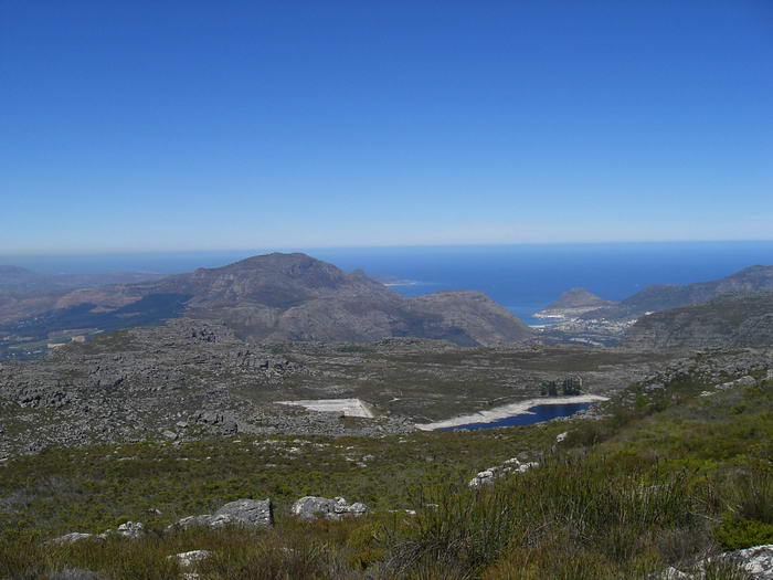 Ein Weg führte nicht weit von der Abbruchkante des Table Mountains, immer weiter in süd-westlicher Richtung. Zudem war auch der Touristenauflauf nur 15 Minuten abseits der Bergstation kaum noch vorhanden, sodass wir uns entschlossen, den durch einen gelben Fuß auf den Fels gemahlen und somit markierten Weg weiter zu folgen. Nach etwa 90 Minuten und zwischenzeitlichen kleinen Klettereinlangen, erreichten wir das Ende des Wanderweges, den MacLears Beacon, dem eigentlich höchsten Punkt des Tafelbergs. Von dort bot sich ein genialer Blick auf die Cape Flats, die südlichen Stadtteile, bis Hout Bay, die False Bay und leicht im Dunst gelegen, sogar das Kap der guten Hoffnung. Nicht zu vergleichen mit dem an der Bergstation. Nach 15 Minuten Rast am höchsten Punkt, der durch aufeinander gestapelte Steine markiert ist, begannen wir mit dem Rückweg. Da es sich um einen Rundweg handelt, ging es an der anderen Abbruchkante des Bergs zurück. |