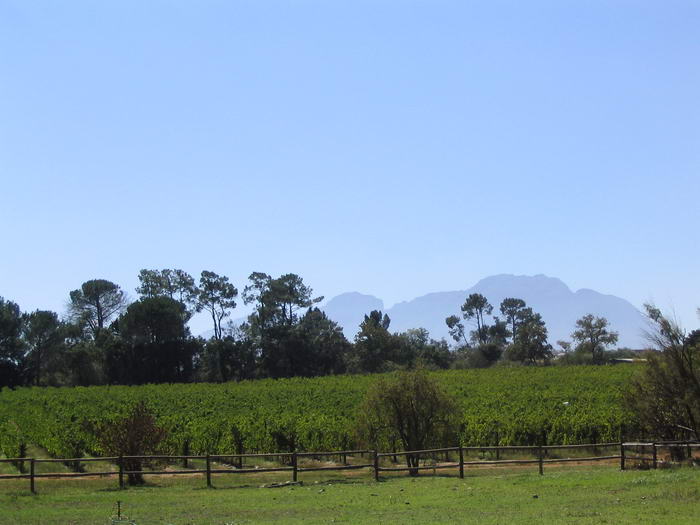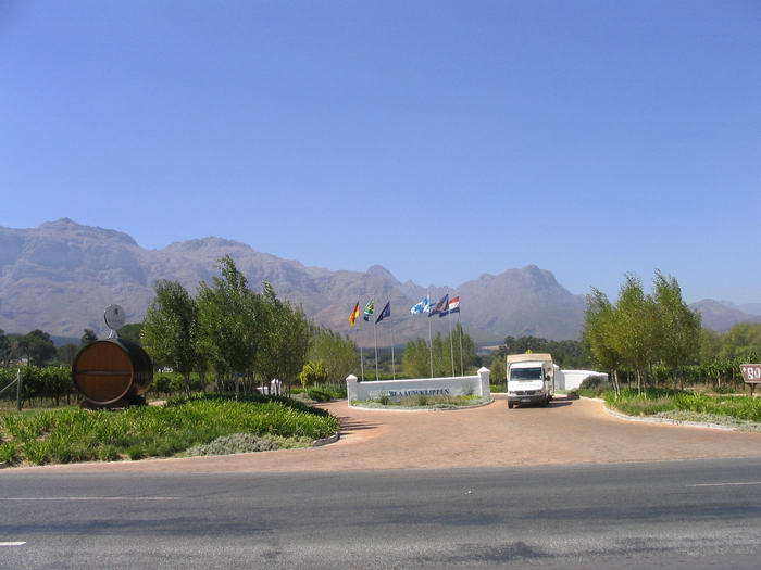Wir liefen über das Gelände in eine offen stehende Scheune, mit alten, historischen Kutschen (mit denen auch Fahrten veranstaltet werden). Weiter durch die Außenanlagen der Produktion (große Tanks) und dem Außenlager zu einer Pferdekoppel und zu den in Reih und Glied wachsenden Weinreben. Abschließend zum angrenzenden Restaurant, welches aufgrund seiner Atmosphäre recht gehoben wirkte, wo wir uns auf die Veranda setzen. Dort liefen wir es uns gut gehen und probierten Straußengulasch mit Riesegarnelen. Absolute Spitzenklasse – so gut, dass der Entschluss steht, zu Hause im Sommer beim Grillen auch mal Strauss zu kaufen. Das Weingut Blaauwklippen wirklich sehr beschaulich und übersichtlich auf uns. Entgegen dem Weingut Fairview, welches wir am Folgetag in Paarl besuchten, war dieses vom Massentourismus noch weit entfernt. Lediglich acht Autos standen auf dem Parkplatz und keine Reisebusse (siehe Fairview). Im Restaurant fragten nach einer Führung über das Gelände und Besichtigung der Weinkeller. |