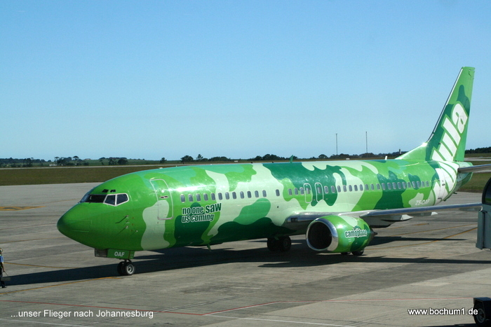 pünktlich unsere quietsch - grün lackierte Boeing 737-400 anrollen.