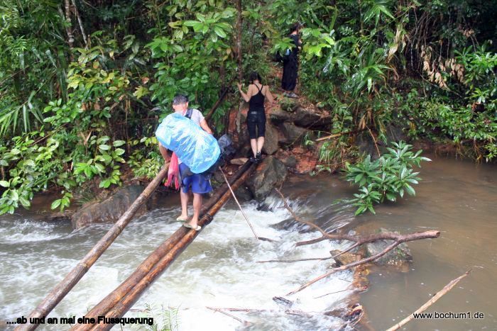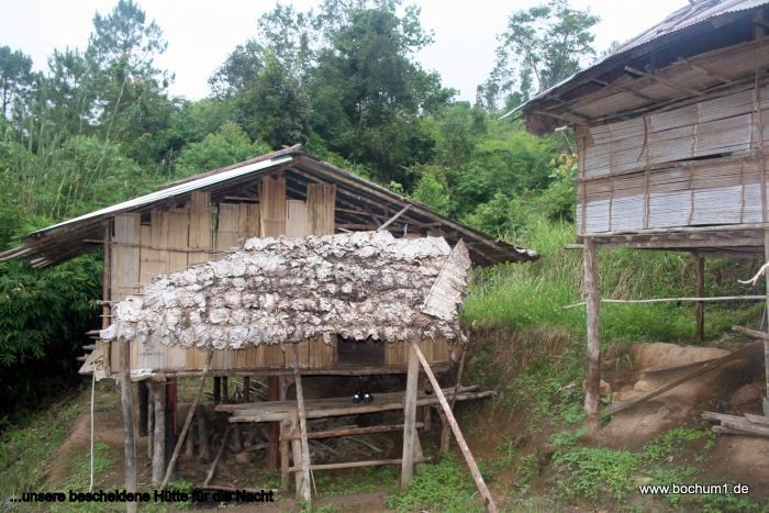 erreichten. Drei Holzhütten auf Stelzen, direkt am Fluss, nahe
