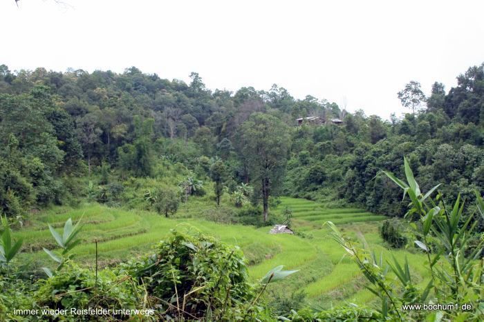 gehüllten Bergen im Hintergrund und immer wieder Reisfelder. Bis