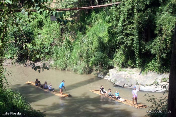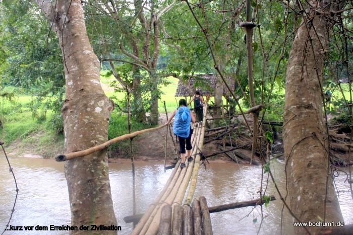 eine hohe Hängebrücke über den Fluss gespannt ist. Nach 30 Min.