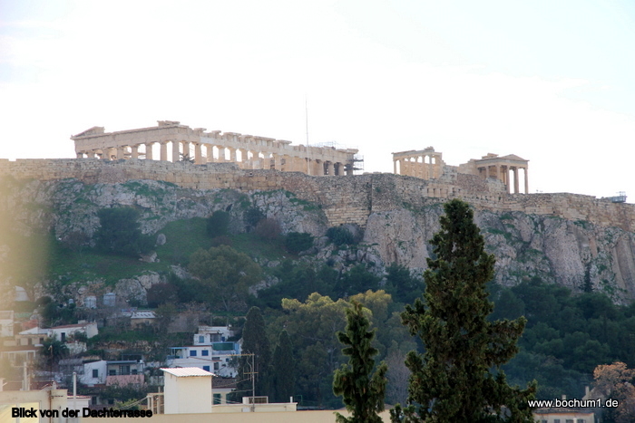 auf die Dachterrasse setzte und dabei die schön beleuchtete Akropolis