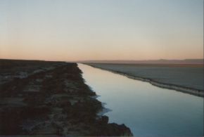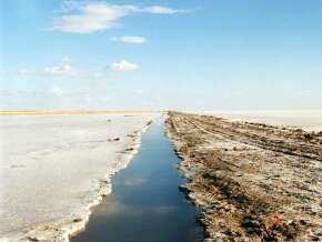 Je weiter man auf den Salzsee fährt, umso karger wird die Landschaft, denn das Salz lässt außer ein paar hartnäckigen Sträuchern, anderen Pflanzen keine Change. Man sieht schließlich nur noch eine, auf beiden Seiten bis zum Horizont reichende, weiße Fläche, welche von Gebirge begrenzt wird. Aufgrund der Ebene sahen wir auf dem See eine Fata Morgana, in Form einer Stadt mit Palmen. Der Trick, Luftspiegelung von Realität zu unterscheiden, besteht darin, sich flach auf den Boden zu legen und wenn dann immer noch alles an seinem Platz ist, hat man richtig gesehen. Dem war aber bei uns nicht. Mitten auf dem See gibt es, wie eine Raststätte sozusagen, einen Souvenirshop, wo man Salzrosen vom Chott kaufen kann. Wer es glaubt wird selig....Am nördlichen Ende der Salzseeüberquerung steht ein altes, verrostetes Autowrack, welches aus dem Salzsee gezogen wurde. |