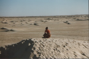 Im Ort begegneten wir reichlich Jeeps mit europäischen Autokennzeichen, welche Douz zum Auftanken von Benzin und Lebensmitteln, vor der großen Durchquerung nutzen. Als nächstes fuhren wir an den Stadtrand, wo die Sahara begann. Im Hintergrund sahen wir die Aufbauten eines Filmdrehs, wurden allerdings beim Annähern von einem Amerikaner verscheucht. Also suchten wir uns einen anderen Zugang zur Wüste, welcher schnell gefunden war. Da wir keinen Vierradantrieb hatten, liefen wir ein wenig über Sanddünen hinein und merkten, wie feinkörnig der Sand war. So etwas hatte ich bisher an keinem Strand erlebt. Auf einen Kamelritt, welche im Ort reichlich angeboten wurden und ich zwei Jahren zuvor schon mal gemacht hatte, als auch auf eine Wüstentour mit dem Jeep verzichteten wir. |
