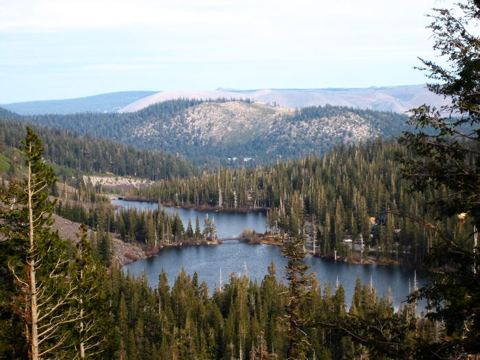 An der CA-203 bogen wir in westlicher Richtung zum 4.000 Einwohner Ort Mammoth Lakes ab, welchen wir nach 3 Meilen erreichten. Auf dem Weg dort hin lasen wir auf einem Schild, dass die Straße zu unsrem Ziel, das Devils Postpile Monument (sechseckige Basaltsäulen, bis zu 20 Meter hoch) bereits Wintersperre hatte. Im Ort hatte ich den Eindruck, in den Alpen zu sein. Die Hotels hießen Garmischer Hof, Innsbrucker irgendwas und Alpen sonst was. Wir fuhren durch über die Main Street und kamen so direkt auf die Lake Mary Road, welche uns zuerst zu den Twin Lakes führte. Nach kurzem Fotostopp weiter über asphaltierte Bergstraße, durch malerischer Landschaft zum Ende der Straße zum Horseshoe Lake. Nach Westen direkt vor dem Massiv der 4.000´er Berge der Sierra, stehen dort Bäume, bzw. nur noch der Stamm mit ein paar großen Ästen, welche aufgrund des aus dem Boden entweichenden CO2 abgestorben sind. Reichlich Heinweisschilder bezeichnen auch die Gefahr, welche aus dem Gas hervorgeht. |