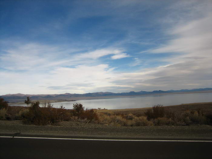 Kontrovers wird dabei die Tatsache behandelt, dass der Wasserstand aufgrund von Wasserentnahmen aus den fünf Zuflüssen für L. A., seit 1941 um 15 Meter gefallen ist. Zuerst liefen wir über den rollstuhlgerechten Fußweg zum Ufer, wobei man automatisch an den ersten Tufas (säulenartige Gebilde aus Kalziumkarbonat, bzw. Kalk, dessen Alter etwa 13.000 Jahre beträgt) vorbei kommt. Jene waren zur Zeit des niedrigen Wasserstandes noch im Wasser und entstanden aufgrund der Wechselwirkung von den Zuflüssen, mit den Alkalisalzen des Sees. Wenn man am Ufer steht, kann man genau beobachten, wie kleine Blasen aufsteigen, die Erde unter dem Seeboden also noch aktiv ist. Es ist eine geniales Bild. Der tiefblaue See, mit den bis zu 10 Meter hohen Tufas und die verschneiten 4.000´er der High Sierra im Hintergrund. Wir liefen am Ufer entlang, immer weiter östlich, teilweise durch Sand. Später durch morastiges Gebiet, bis wir nach 15 Minuten eine weitere Ansammlung von Tufas erreichten. |