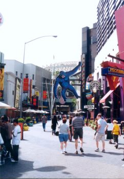Jene nahm ich dann mit dem Auto den Berg hinunter, setzte sie unten ab und fuhr zu den Universal Studios, welche keine 2 Minuten Fahrt entfernt waren. Hier waren für den Parkplatz $6 fällig und es gab auch kein Entrinnen ohne einen langen Fußmarsch. Als erstes gelangt man, ohne Eintritt in den Universal Citywalk. Hier befinden sich allerlei Restaurants und Souvenirgeschäfte, welche alle einen thematischen Bezug zu einem Film haben. Auf dem großen Platz davor ist auch das Hard Rock Hollywood mit einer überdimensional großen Gitarre. Der Eintritt war mit $45 ausgesprochen happig und es gibt keine Vochures dafür. Aber im Nachhinein betrachtet, hat sich das gelohnt. |