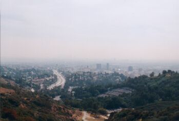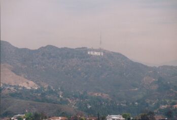 Dann machte ich mich auf den Weg, den Hügel hinaufzufahren, auf welchem sich das Hollywoodschild befindet. Zwar befinden sich in der Sackgasse schöne Anwesen, aber man hat keinen Zugang zu dem Schild. Also wieder den Berg hinunter und zu einem Vista Point, welcher in meinem Reiseführer stand. Diesen suchte ich wegen mehrmaligen Verfahrens auch über eine halbe Stunde und verlor fast die Nerven. Aber schlussendlich fand ich ihn. Von dort hat man einen wunderschönen Überblick auf Los Angeles, welche bereits um 11 Uhr ein wenig im Smog lag. Auch der Blick auf das Hollywoodschild war gut. Es wurden Fotos gemacht und ich sprach ein wenig mit zwei 20 jährigen Schweizern, die zu Fuß dort hinaus spaziert waren. |
