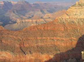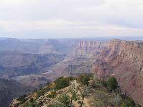 Nach einer weiteren ¾ Stunde, in welcher ich aber nur 30 Meilen zurücklegte, erreichte ich den östlichen Eingang des Grand Canyon Nationalparks. Auch hier wurde mein Golden Eagle Pass wieder gründlich geprüft, was bedeutet, dass die Unterschrift, mit jener auf dem Personalausweis verglichen wurde. Nach keinen zwei Minuten Fahrt im Park, erreichte ich gegen 16.30 Uhr meine erste Ausstiegsstelle, den Dessert View. Dort wurde zu dem Zeitpunkt viel an den Strassen gebaut, wohl um die Parkmöglichkeiten zu erweitert. Obwohl ich den Grand Canyon schon von meinem letzten Besuch kannte (aber nicht den östlichen Teil des Parks), war es trotzdem wieder imposant, wie sich an dieser Stelle die Erde „auftut“ und eine Spalte von 1.700 Meter zulässt. Vom Dessert View aus (der höchste Punkt des Parks, mit 2.267 Metern übrigens), konnte man sogar den Colorado unten fließen sehen, was an den westlicheren Punkten nicht der Fall ist. |