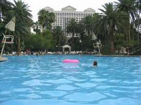Leider war das Zimmermädchen noch im Nachbarzimmer beschäftigt und gab und zu verstehen, dass sie sich im Anschluss um mein Zimmer kümmern würde. Na ja..... Also bin ich wieder runter zur Eingangshalle, holte weitere Dinge aus dem Auto, zog mich schnell auf dem Zimmer um und ging herunter zum Pool. Eine irre Poollandschaft ! Möchte nicht wissen, wie viele tausend Liter Wasser sich die Sonne daraus jeden Tag zieht. Am Eingang eine kurze Kontrolle, ob man Hotelgast ist und danach werden die Poolhandtücher gereicht (so viele man übrigens möchte). Lediglich einen kleinen Fehler hat der Pool in meinen Augen. Keine Stelle ist tiefer als 1,20 Meter. Also eher ein superriesiger Planschpool. Folglich lag ich in den nächsten 3 Stunden auf der Liege oder „badete“, bei etwa 40 Grad Außentemperatur. Gegen 18 Uhr ging ich, interessiert dadurch, dass so viele Leute einen roten Cocktail in der Hand hielten, zur Poolbar. An jener wird man, während man an der Bar sitzt, fortwährend auf dem Rücken mit einem Gemisch aus Wasser und Gas kühl gehalten, welches aus Düsen aus dem Strohdach der Strandbahrhütte entweicht. Klasse Idee. Jedenfalls zahlte ich für einen halben Liter Bier auch gute $6, da währe der Pool zum kühlen günstiger gewesen.... |